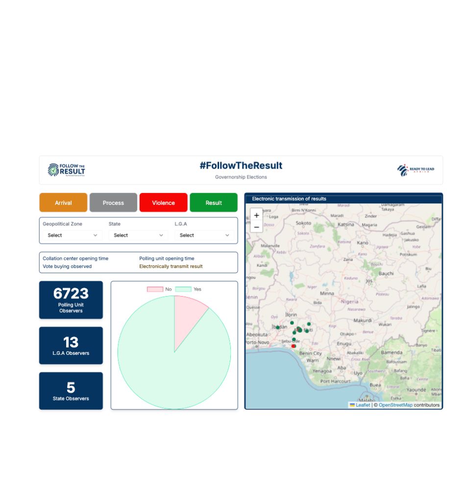 A real-time election monitoring dashboard designed to track election processes, results, and incidents of violence. It provides live updates, data visualization, and citizen-driven reporting to ensure transparency and accountability in electoral processes.